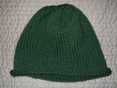 Of course, the whole time I was knitting I was worried about running out of yarn. I was also planning on doing a 2 inch ribbing on this hat, but I forgot until I had finished the first row, and I didn’t want to start over. Plus, I had some problems the last time I tried ribbing, and I wanted this hat to look nice. Luckily, once I started the actual knitting, everything went fine and I finished pretty quickly.