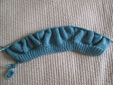 I’m still (somewhat slowly) working on the “Easy Shrug”. I’m a bit farther now than this picture shows, and I should be able to separate the sleeves from the body this weekend.