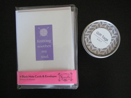 These are from Knitterella. She has some really cute note cards and the ones I got have 3 different quotes on them: “Knitting warms my heart.” Knitting brings me peace.” Knitting soothes my soul.” And look at the cute gift tags! Half the tags look like knit stitches and the other half look like purl stitches.