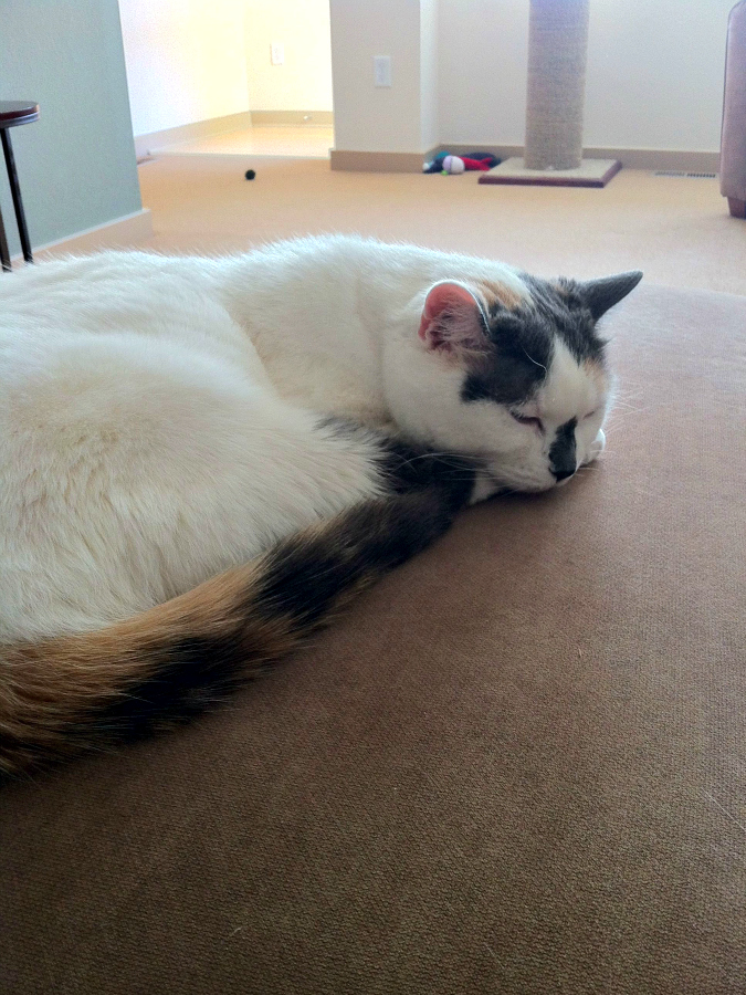 1. The top image is a little deceiving. She’s actually lying on an ottoman, but it blends in with the floor. If it WERE the floor she would be giant compared to the objects in the background, and we don’t need that!