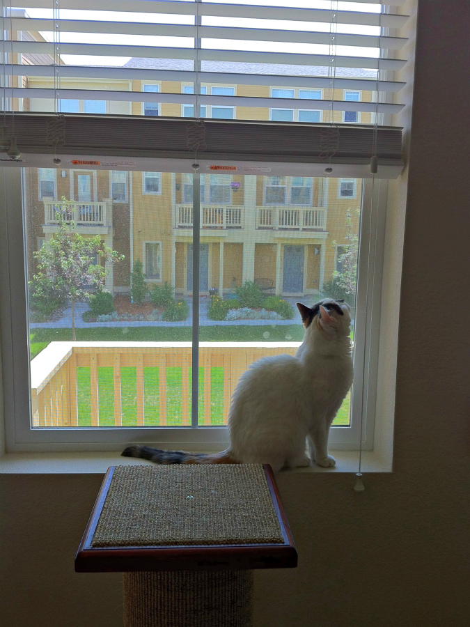 1. It was a fly. She gave up on it and I had “take care of it”. Sometimes she’ll wait patiently like that, then snatch it out of the air with her paws, and slowly lower it to the floorโ€ฆ it’s quite something.