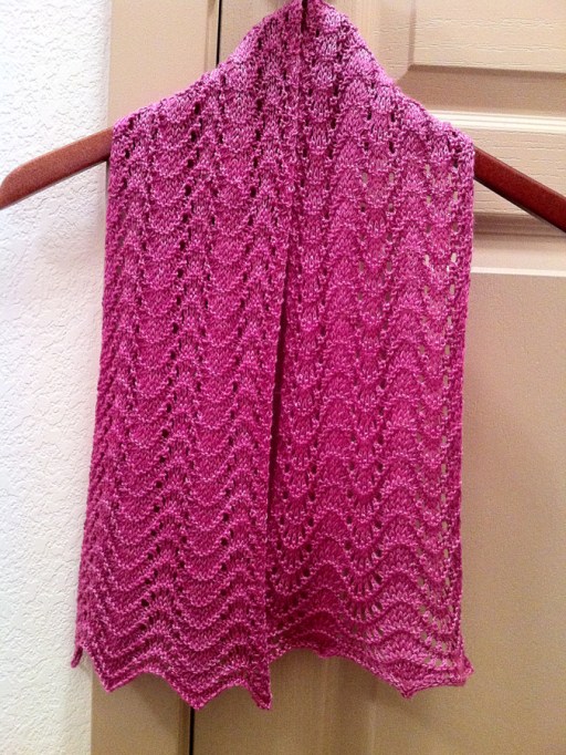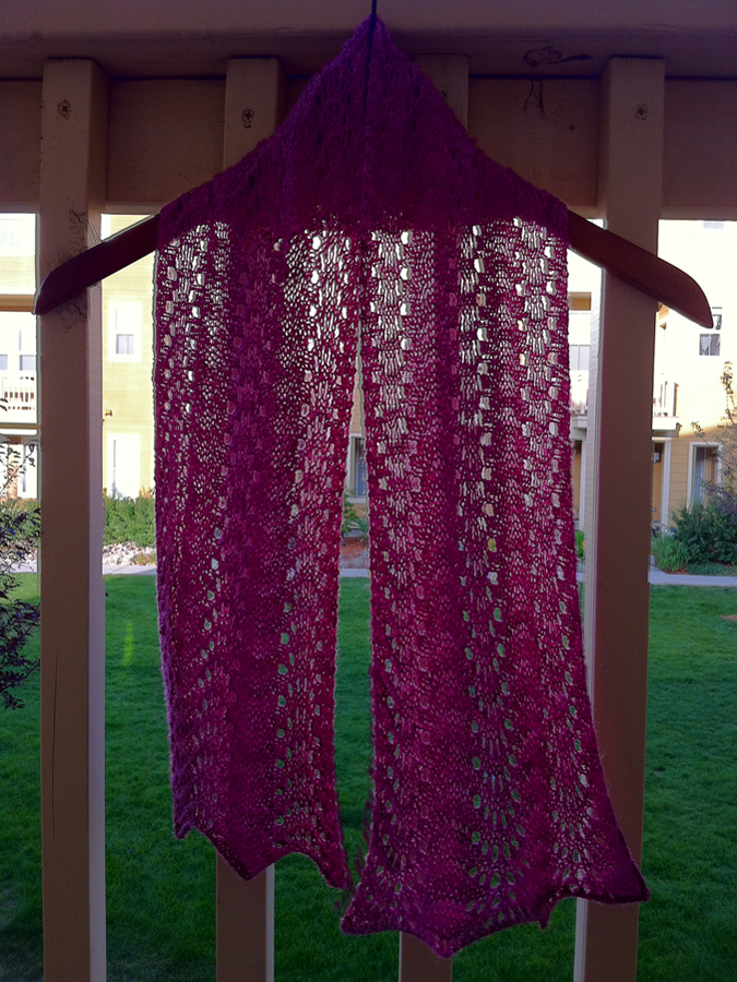 A couple of months ago a friend had an open house to showcase hand-dyed yarns and patterns from Myra Garcia of Fancy Image Yarns. Myra had some lovely yarns, and I picked up 1 skein of a really pretty fingering weight yarn, 50% merino wool/50% tencel. I decided to knit the Old Shale Scarf pattern by Tiennie Knits (link opens as PDF).