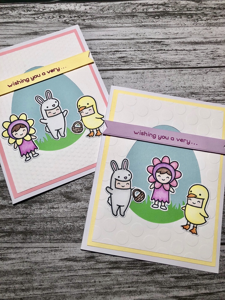 I cut the egg shape with my Silhouette Cameo and then embossed the panel with the Big Shot. I think they turned out so cute! Thanks for this adorable stamp set, Lawn Fawn!