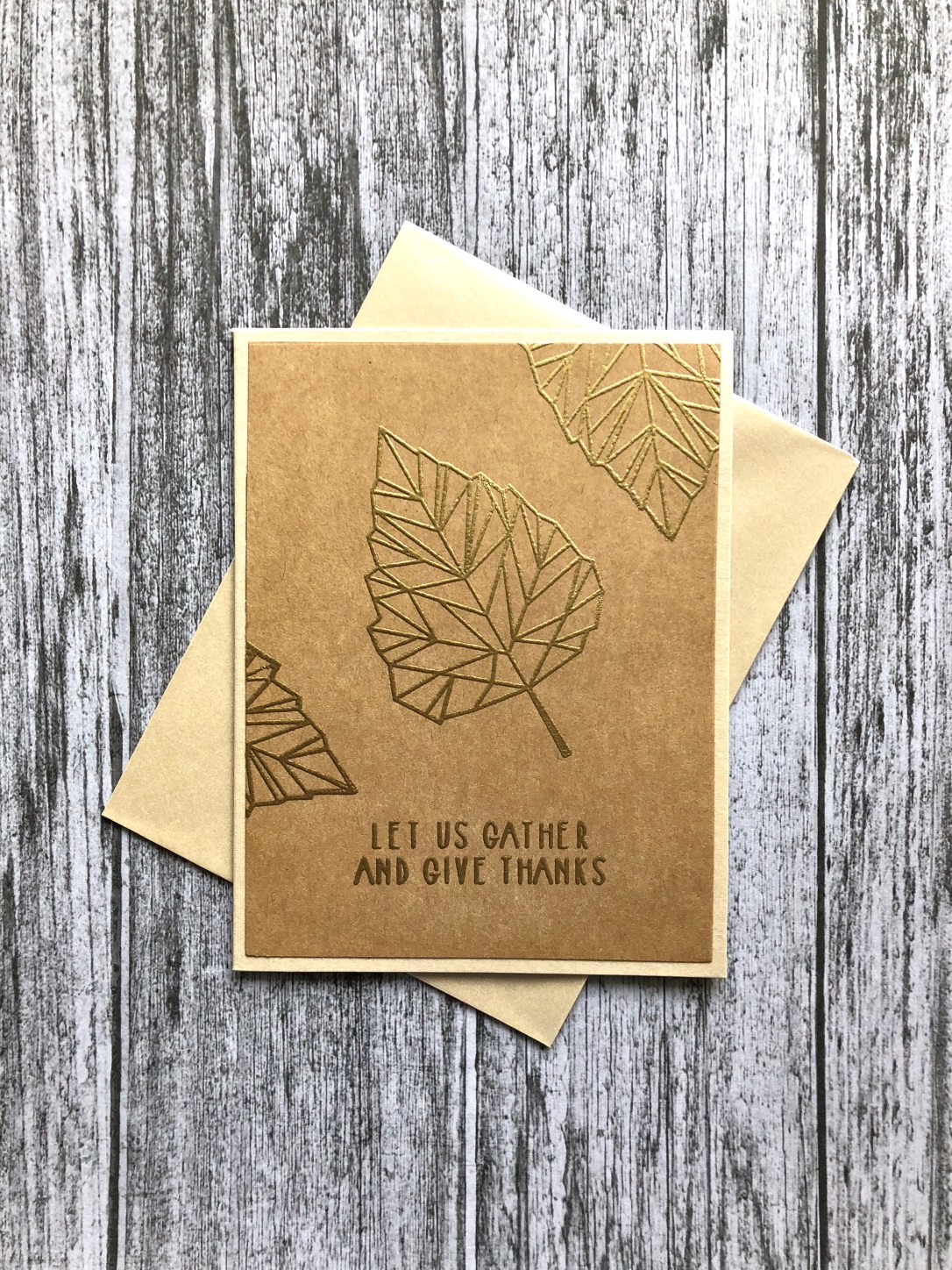 This leaf design is so fun! I stamped it in various spots on both a dark red cardstock panel and a kraft panel using VersaMark ink. Then I used WOW! Embossing powder in Metallic Gold Rich for both the leaf and sentiment. I love the font on this sentiment and the other two in the stamp set.