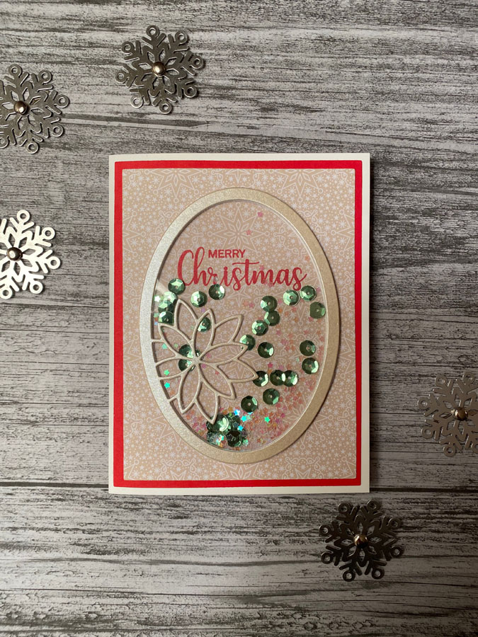 I made this shaker card using the Mod Poinsettia Oval die from Simon Says Stamp. I cut it from a gold paper, and then several times from white paper to build up the space for shaker sequins. The Merry Christmas sentiment is from the exclusive Joy of the Season stamp set by Gina K. Designs.