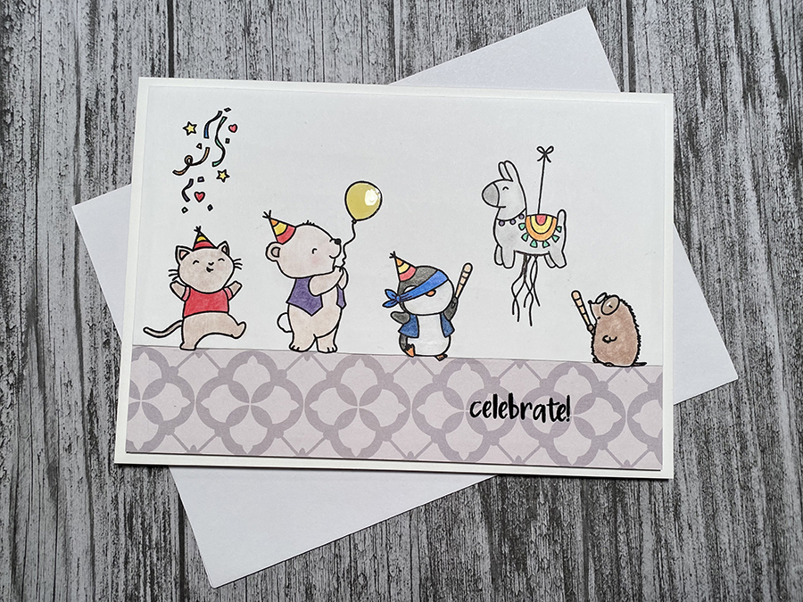 I made the card below for my sister using Mama Elephant’s Piñata Party. I just love the cute animals and piñatas in this set!