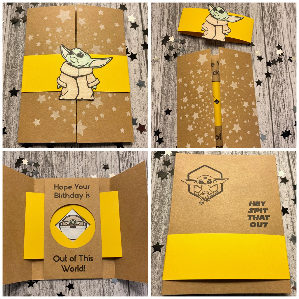 Earlier this year some of our family came for a visit and we were all watching The Madalorian, so I thought the kids would enjoy these birthday cards. For the first one, I wanted to try out the Shutter Card Components die by My Favorite Things.