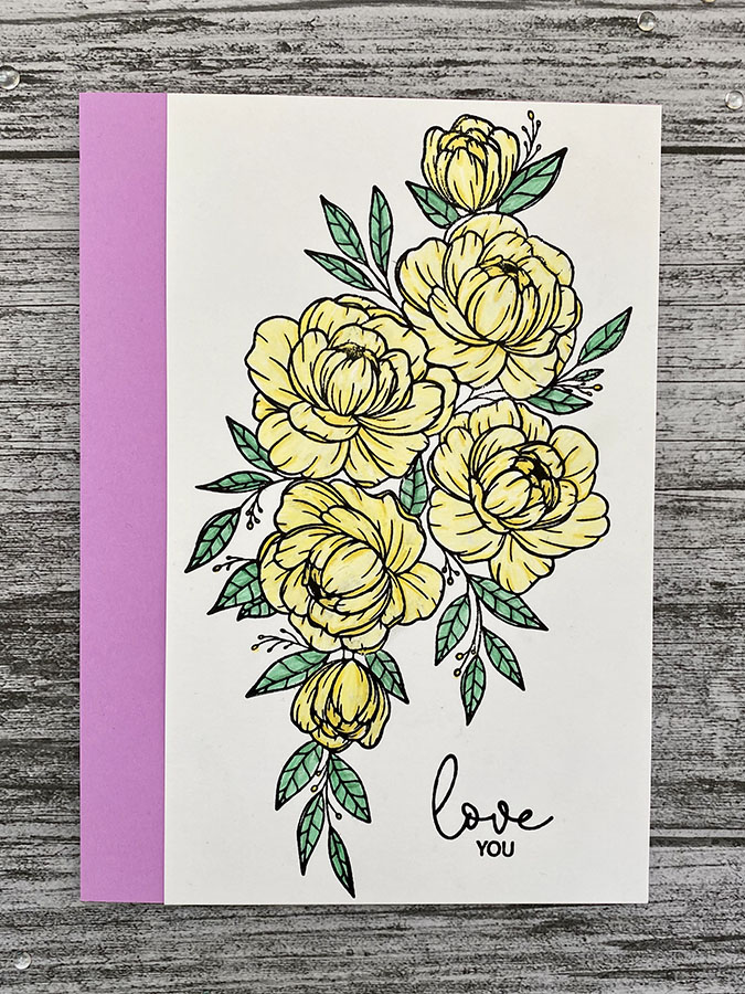 On this card, I used 2 yellow colored pencils for the flowers. I colored both florals in the same way: coloring the whole flower with the lighter colored pencil, and using the darker colored pencil to follow the inked lines to add shadow detail.