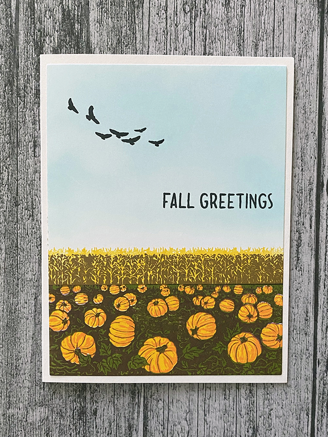 After stamping all the images to create the pumpkin patch and cornfield, I took each panel and ink blended Distress Oxide Ink in Tumbled Glass and Broken China. They each turned out a bit different, which was fun.
