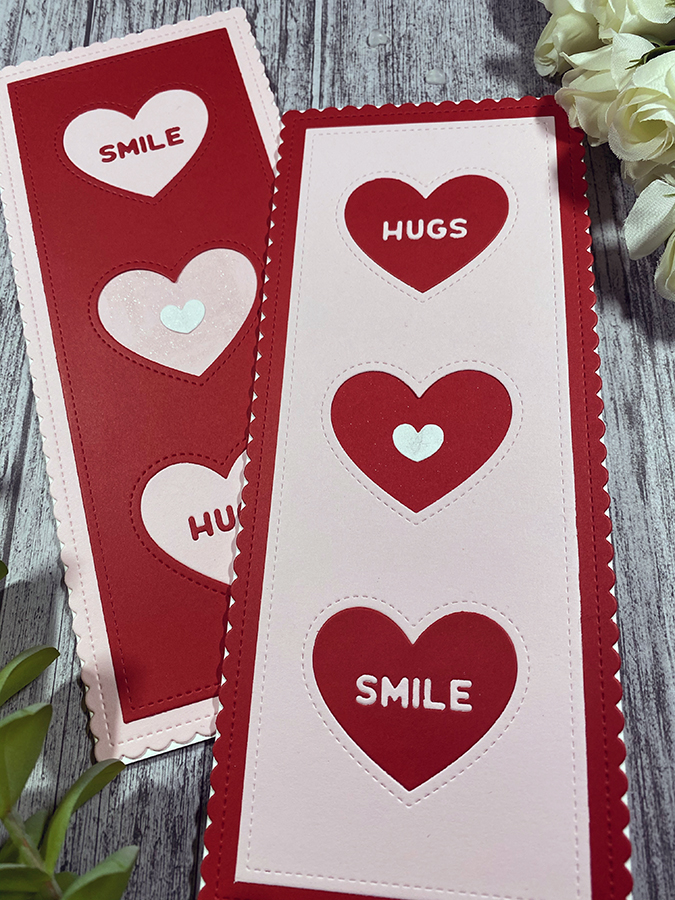 It was especially easy since I used a slimline die set from Lawn Fawn. This is a really fun set with a stitched scalloped rectangle die and a smaller stitched rectangle die that also cuts the interior hearts. I used red and light pink cardstock for the 2 rectangle dies. The 3 interior hearts also cut out the words SMILE, HUGS and UR CUTE. I saved the UR CUTE hearts for another time. I made 2 white slimline card bases and adhered the scalloped rectangles, then the smaller rectangles on top.