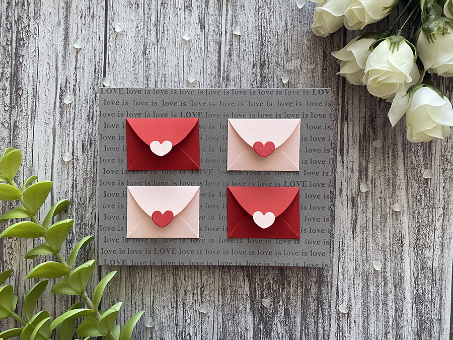 After adhering each envelope to my card, I used another die from the set to cut out mini cards to insert into each envelope. I used a few different stamp sets to stamp little messages and hearts to each card.