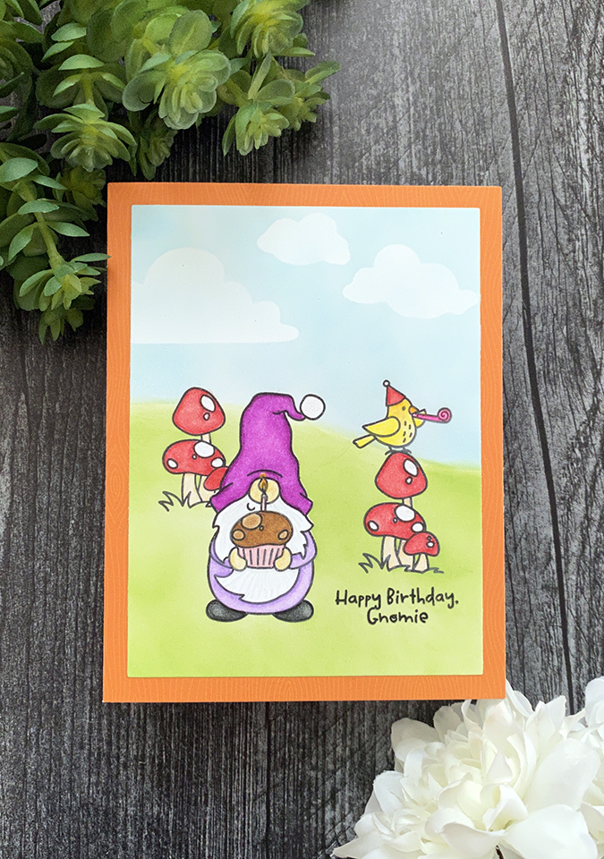 First up is this Gnomie birthday card scene. I stamped the gnome, mushrooms and bird on my card panel, and then stamped them again on masking paper. I masked off the images, added some cloud masks and ink blended my sky and grass. Once that was done I colored the images using colored pencils and gamsol. Then I stamped the sentiment in black ink, topped it with clear powder and heat embossed it for a shiny finish. I used the second largest nesting rectangle die to cut this panel down, and the largest rectangle die to cut a piece of orange woodgrain paper. Then I attached both to a white card base.