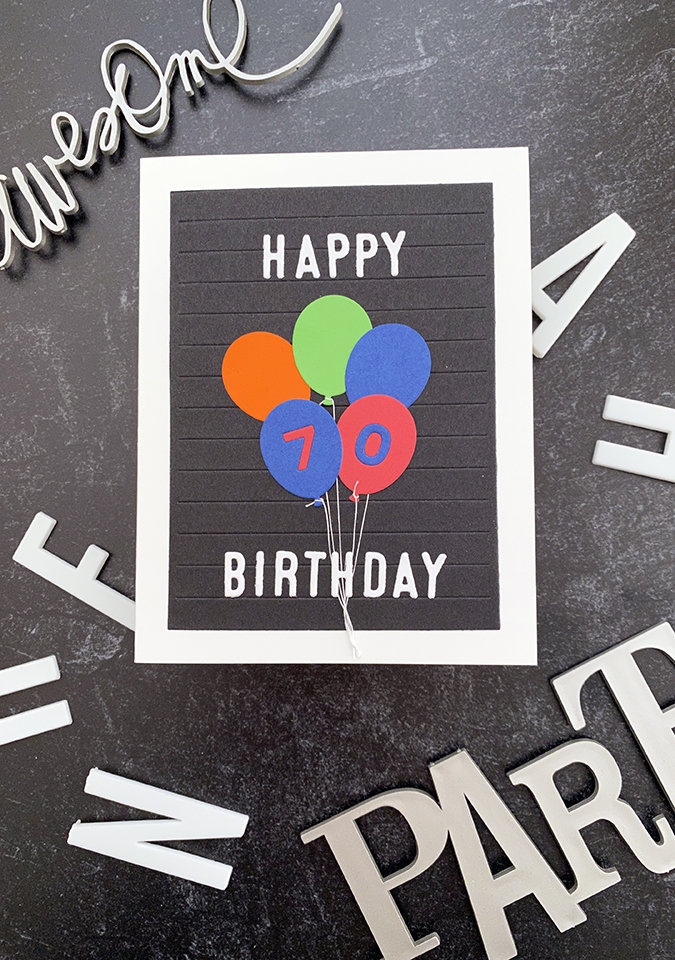These last 2 cards use the same letter board and balloon dies, but they look totally different! For the first card, I just used some colorful scrap cardstock for the balloons, white for the sentiment, and black for the letter board. I die cut everything out and glued it onto a white card base as shown. I tied white string to each of the balloons before gluing them down.