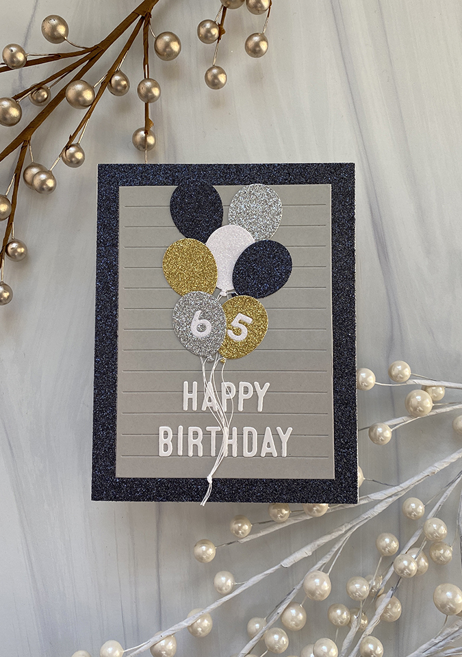 The next card was a request, and I was told the recipient likes “glitzy” things. I thought glitter paper would be perfect for her card! I used the glitter paper for both the balloons and frame around the letter board. I arranged the balloons and sentiment a bit differently than the other card, but otherwise did the same things.