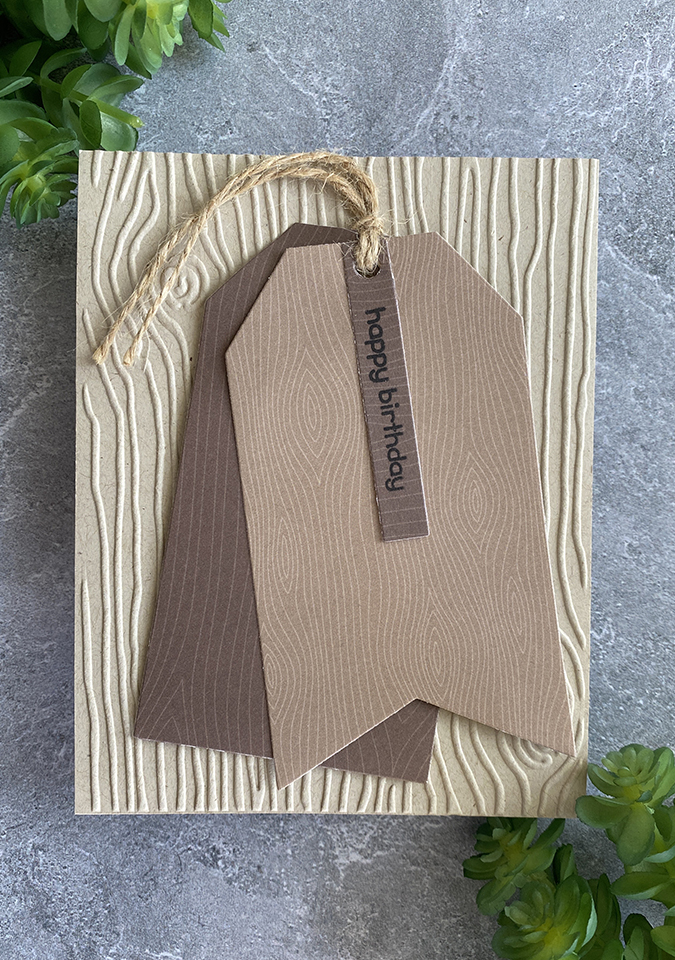 I wanted this card to be very masculine, so I used a lot of browns. I used a woodgrain embossing folder with some kraft cardstock and adhered it to a white card base. I used 3 tag dies to cut 2 different colors of woodgrain cardstock. On the smallest tag I stamped happy birthday (don’t remember which stamp this is), then tied all the tags with a piece of twine. I glued the bottom tag to the front of the card; the other tags are only attached with the twine.