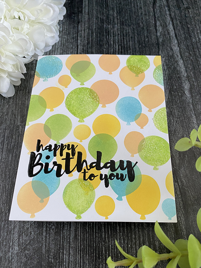 This is a cool layered stencil set that creates a fun bokeh effect with the balloons. Using the first layer, I added the yellow and orange ink. Then I lined up the balloons on the second layer and added green and blue ink. After letting the inks dry I stamped the sentiment in black. Then I stamped it again with versamark ink and heat embossed black powder so the sentiment would stand out a bit more.