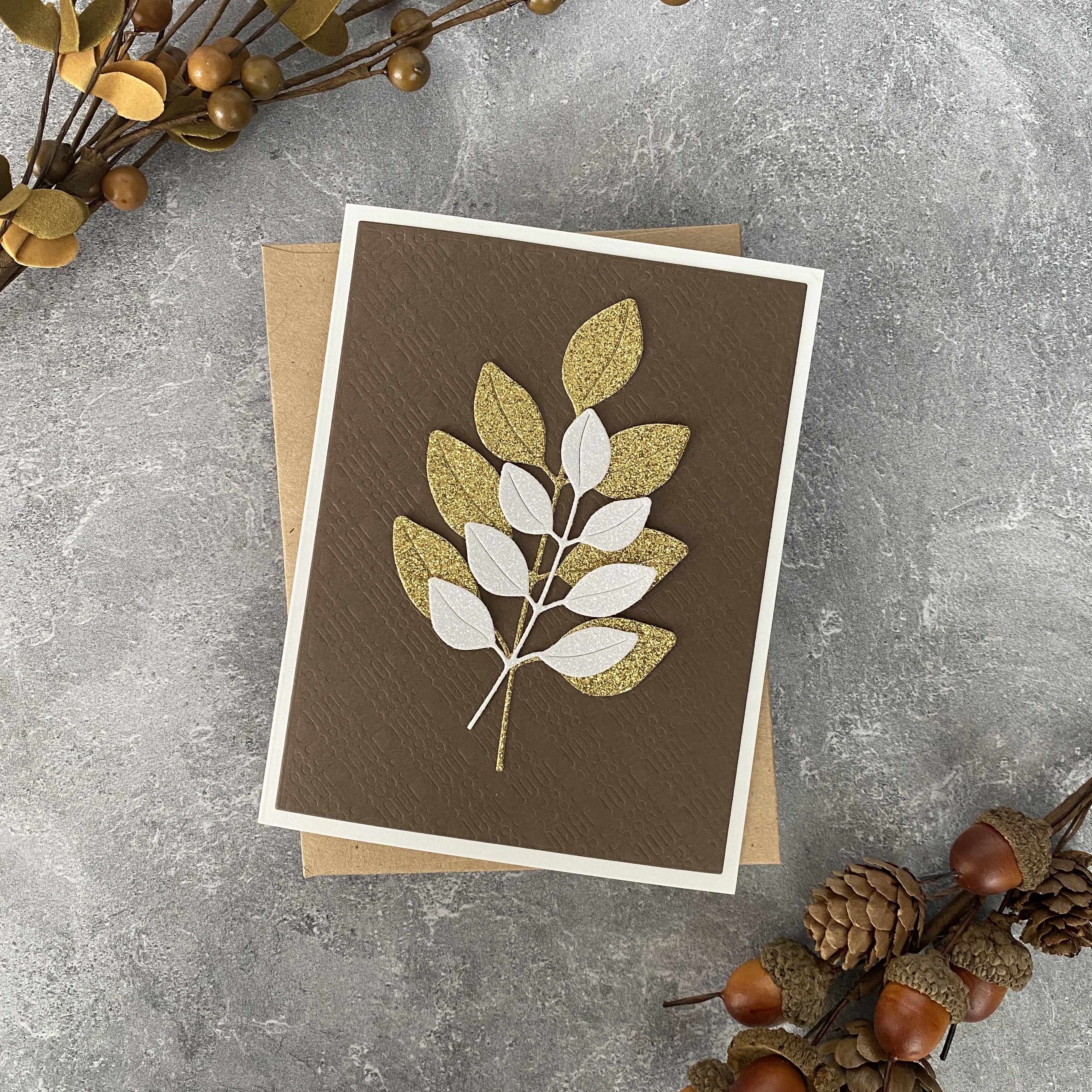 For the first card, I dry embossed brown cardstock with a plaid background die then trimmed it down slightly smaller than my white card base. I attached gold and pearl glitter leaves to the background and adhered it to the card base.