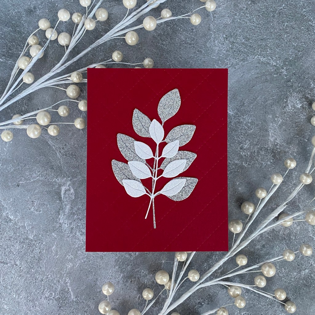 On my second card I used the quilted card front die to dry emboss a piece of dark red card stock. I added silver and pearl glitter leaves and adhered the panel to a white card base.