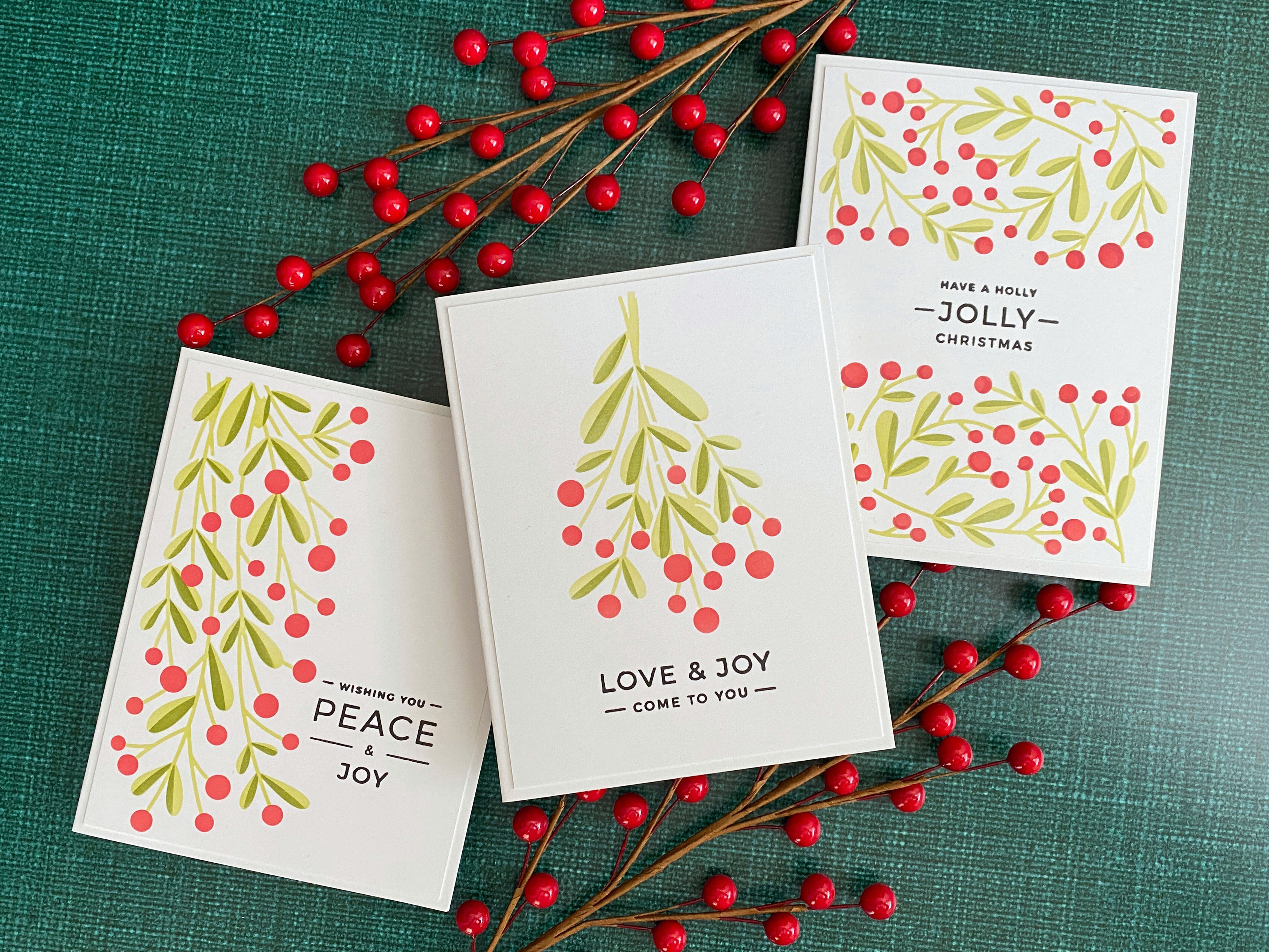 With the white cardstock, I used red ink for the berries stencil. I tried using the second (shadow) layer for the berries, but I wasn’t able to line it up properly, so I just skipped that shadow layer. On the kraft cardstock, I ink blended the berries with white ink.