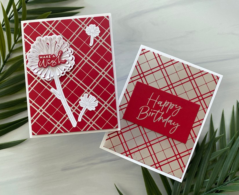 For my first card, I used the plaid hot foil plate with silver foil on a piece of red cardstock. I die cut some dandelions out of white cardstock and adhered them to this panel. I also used silver foil for the ‘make a wish’ sentiment that I die cut and attached to the large dandelion. The panel was then added to a white card base.