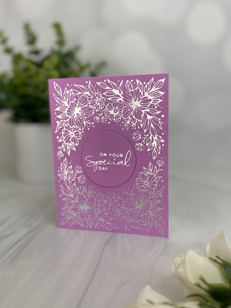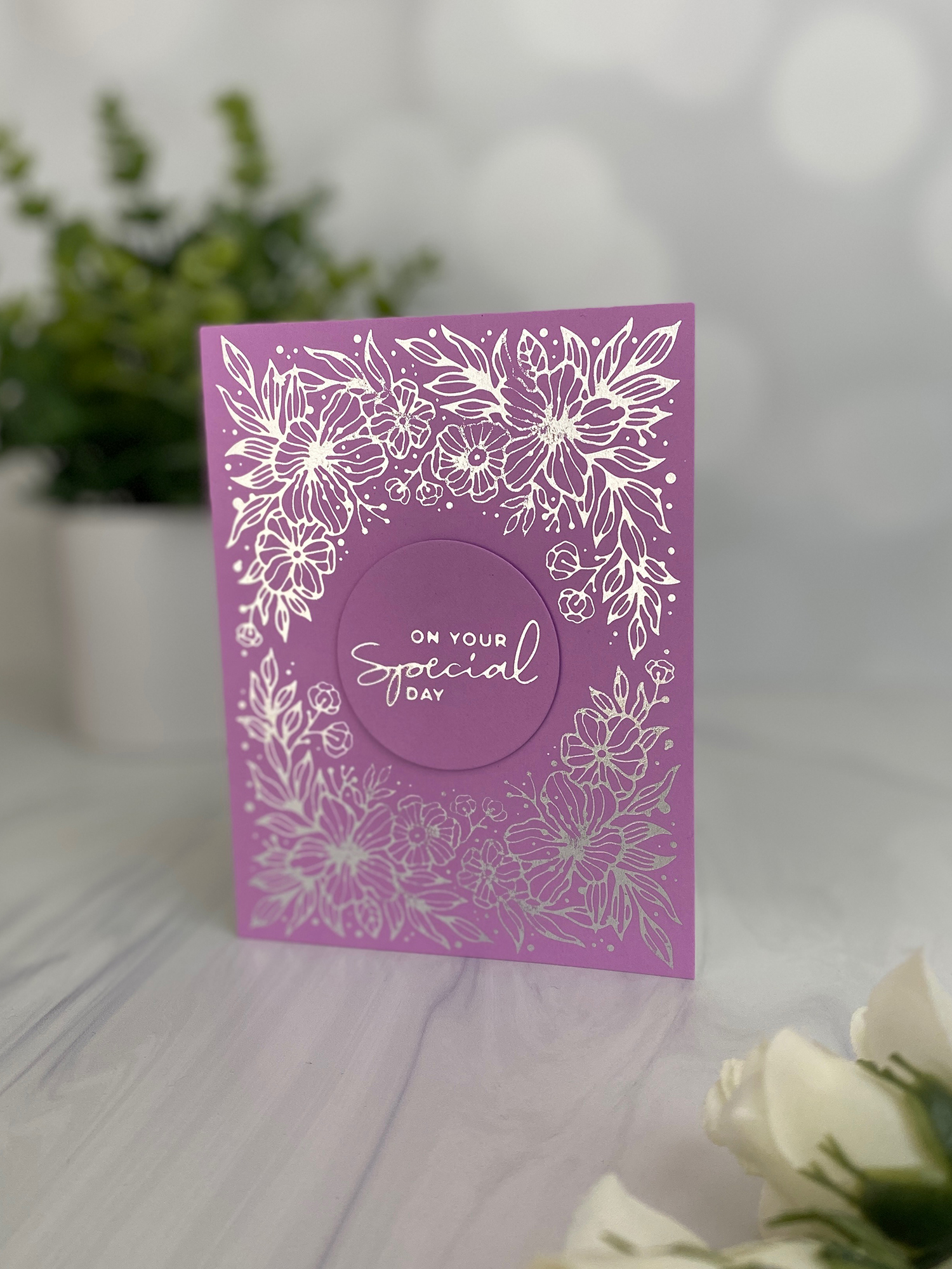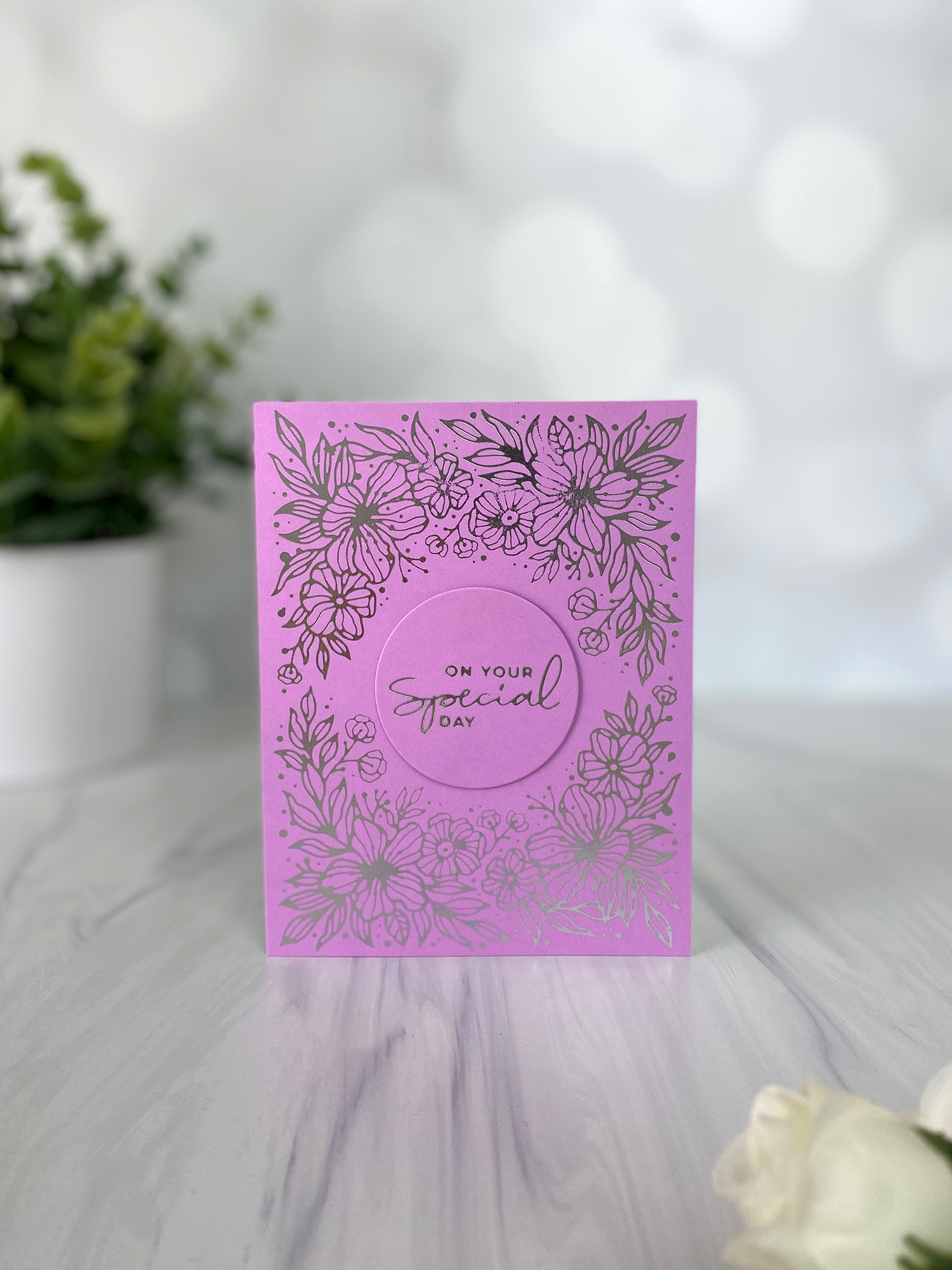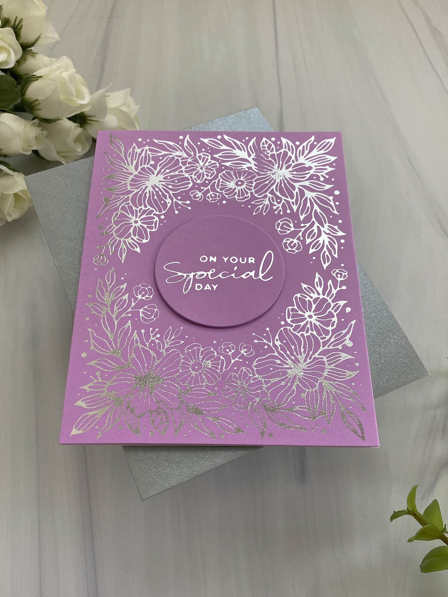This card uses the floral frame starter hot foil plate that came with the glimmer hot foil system. I chose a piece of light purple cardstock and die cut it to the size of my card base. After positioning the floral plate at the bottom of the cardstock, I taped it in place and added the silver foil. Then I repeated this same process with the floral plate at the top of the cardstock.