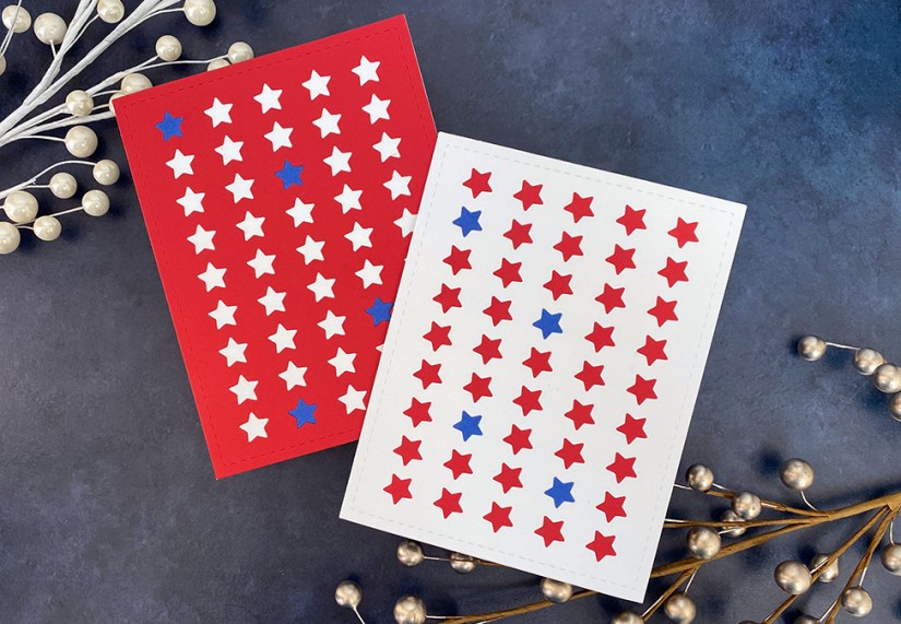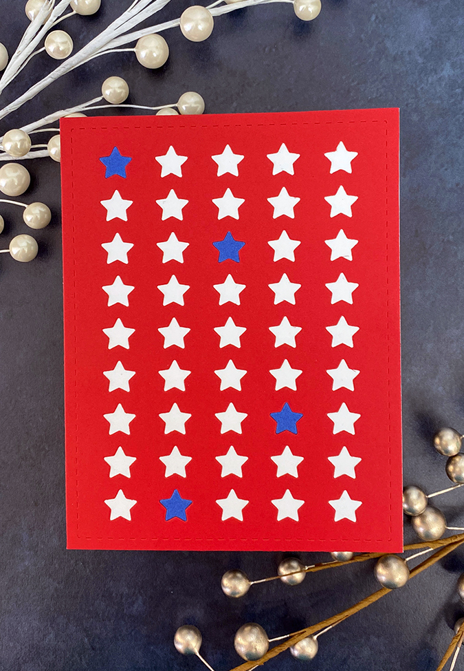 Then I repeated the process with a piece of white cardstock. This time, after adhering the stars panel to my card base, I inlayed all the red stars to the panel.