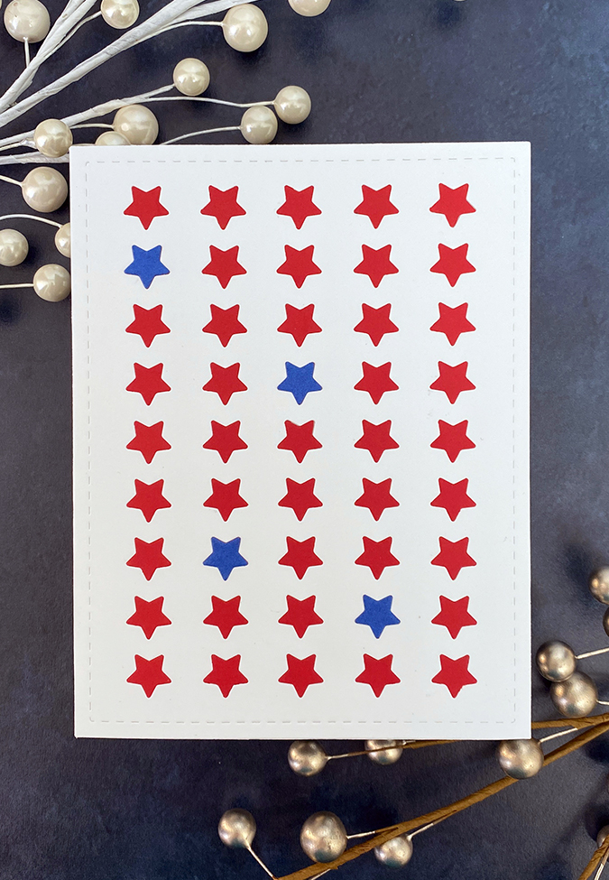 Then I repeated the process with a piece of white cardstock. This time, after adhering the stars panel to my card base, I inlayed all the red stars to the panel.
