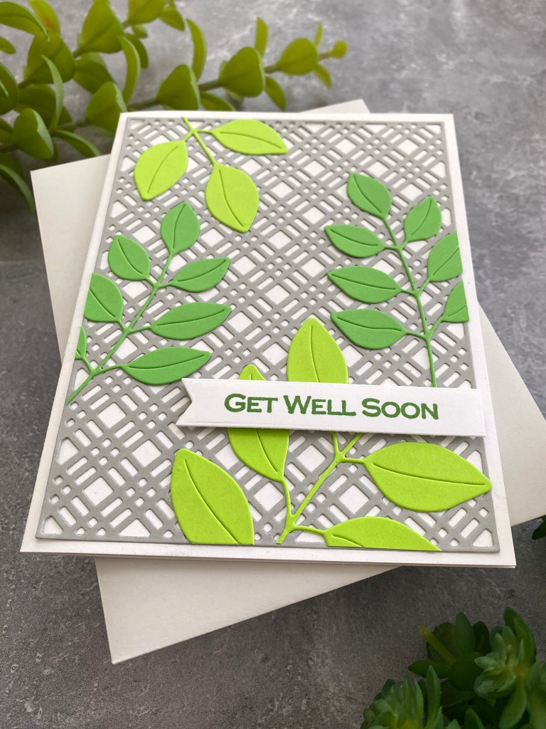It’s fun to make cards with more die cut elements sometimes :) I used a background die with some light gray cardstock and adhered it to a white cardbase. I like that the die is a bit smaller than the card so there’s a nice border. Next I used the smaller leaf die to cut 2 leaf clusters out of dark green cardstock. With the larger leaf die I used a lighter green cardstock, then I cut the top off so I could adhere everything to the card as shown. I also trimmed off the edges of some leaves so nothing went beyond the edge of the gray background.