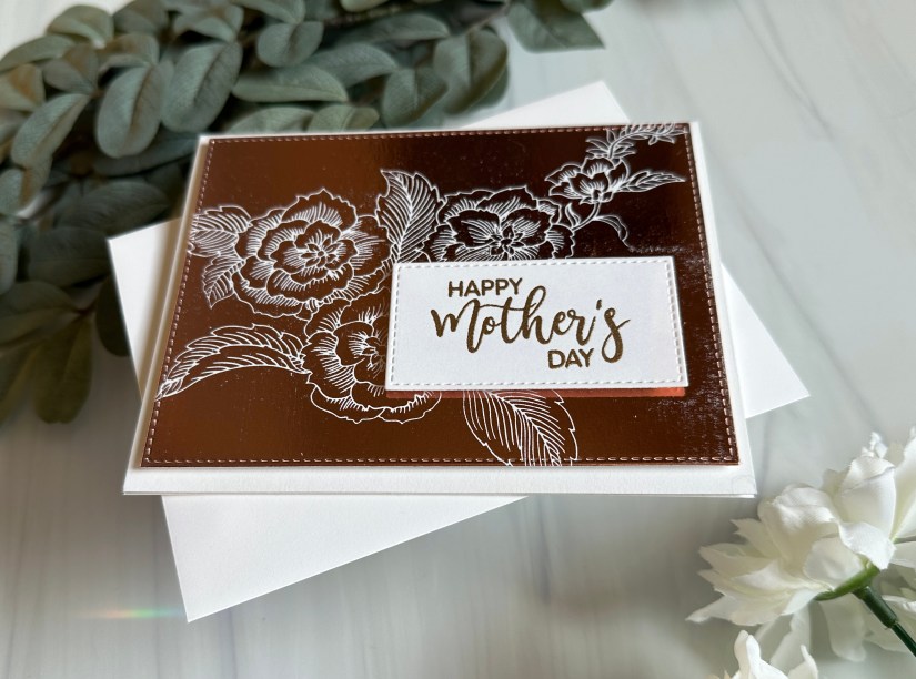 I used the reverse piece of foil on a piece of white cardstock, then cut it down slightly smaller than my white card base. Next I stamped the sentiment with VersaMark ink and heat embossed it with rose gold embossing powder.