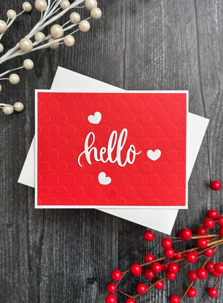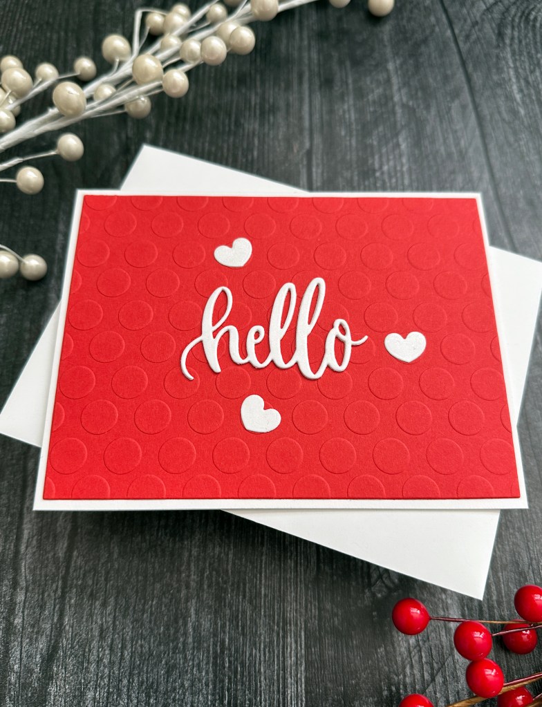 I used a piece of red cardstock with a polka dot embossing folder and trimmed it down to be slightly smaller than my white card base. I die cut the ‘hello’ sentiment 3 times from white cardstock to create some dimension. Next I die cut 3 white hearts, then added clear shimmer to the hearts and sentiment. I adhered the red panel to the center of my card base and added the hearts and sentiment as shown.