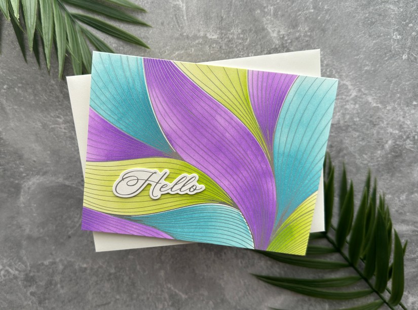 For my last card, I started with a piece of white cardstock and silver foil. Then I used the coordinating stencil set to add 3 colors of ink to my panel before adhering it to a white card base. Next I hot foiled the ‘hello’ sentiment, die cut it and adhered it to the front of the card.