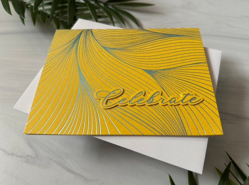 With my first card, I used a piece of yellow cardstock and blue foil, then adhered the panel to a white card base. After hot foiling the sentiment and cutting it out with the coordinating die, I adhered it to the card as shown.