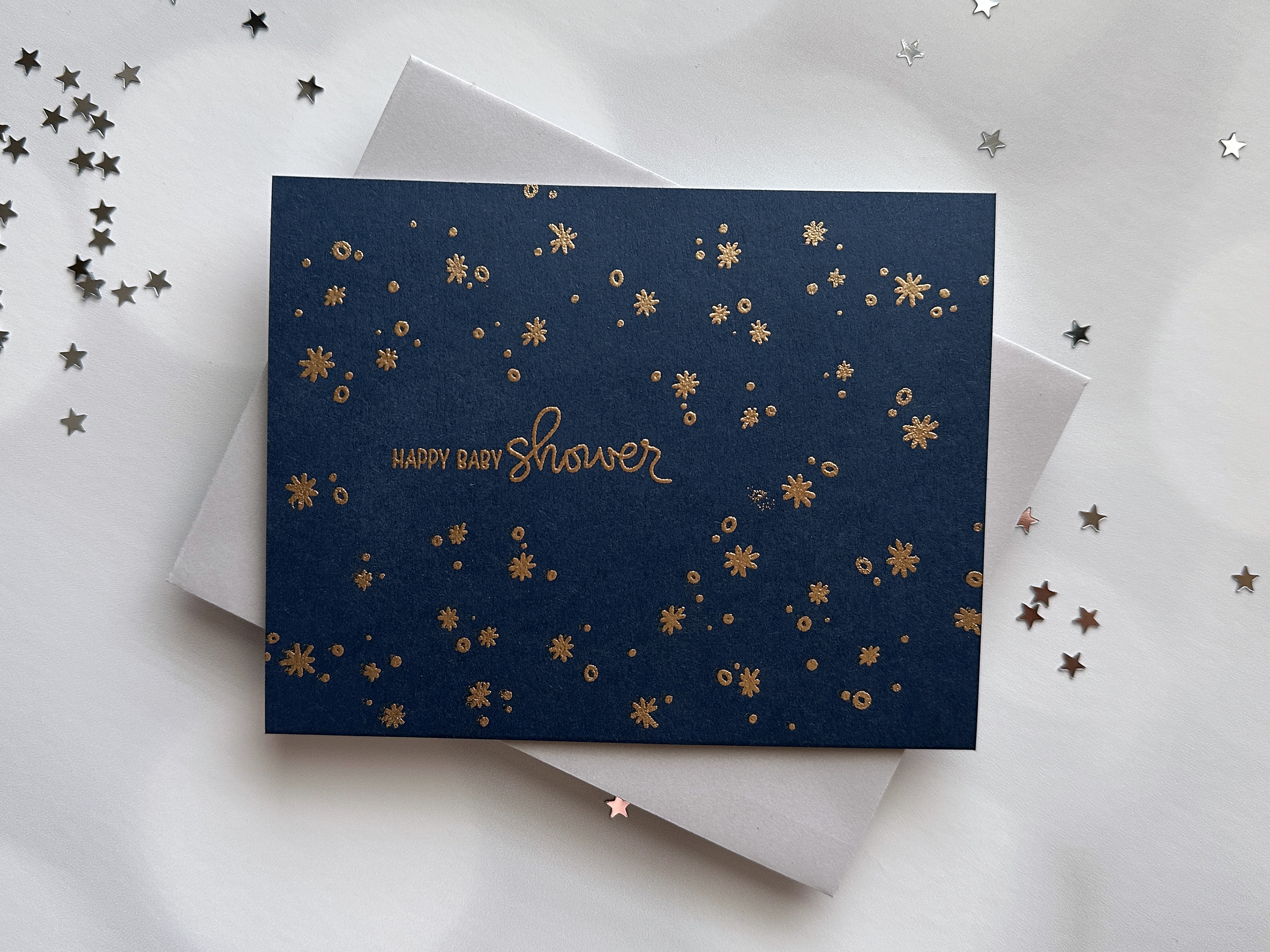 I started with navy cardstock and trimmed it down to an A2 panel for my card front. Next I stamped the background pattern several times on my panel, leaving a space for the sentiment. I added some rose gold embossing power and heated it up.
