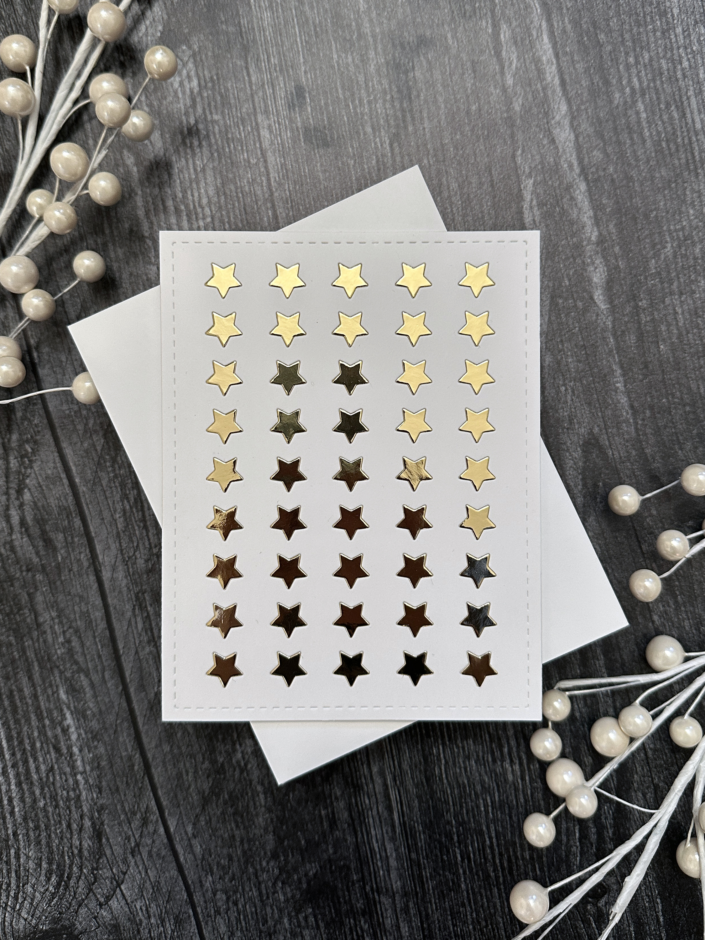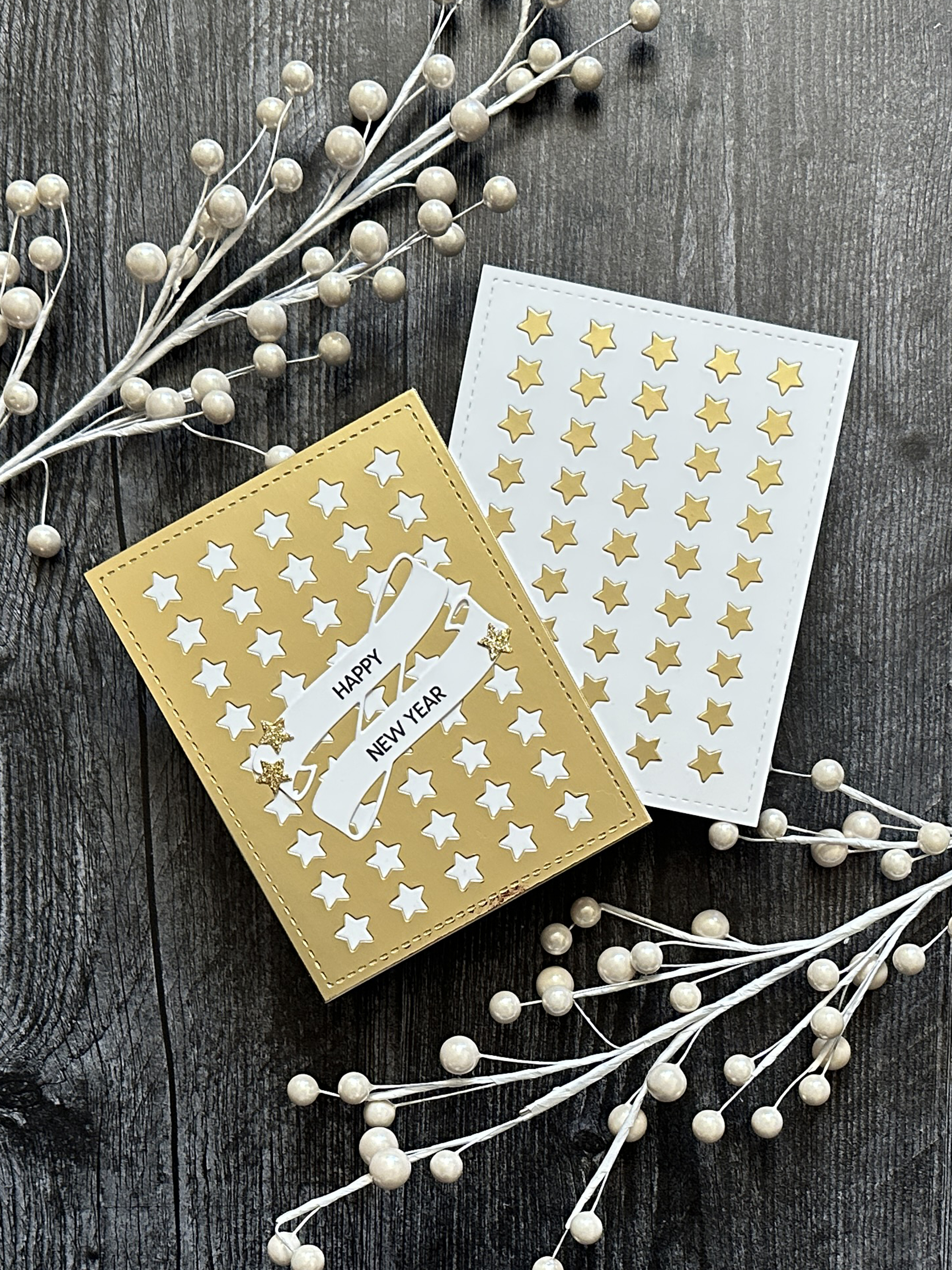 The background panel was used with gold foil paper, and again with white cardstock. I adhered each panel to a white card base. With the gold foil card, I inlaid the white stars, and for the white card, I inlaid the gold stars. I really like how I can pretty quickly get 2 cards using this panel die :)