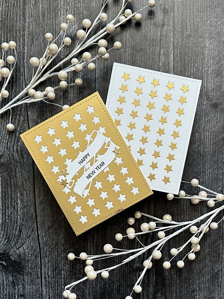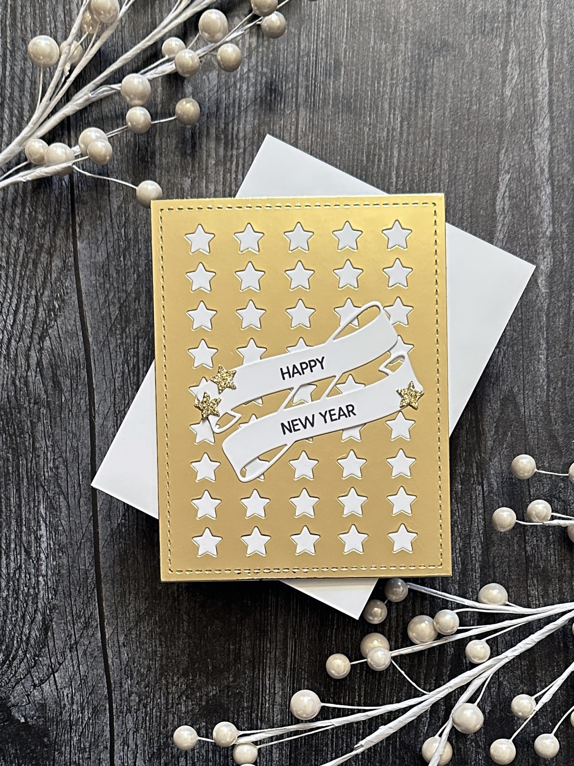 I’m starting the year with a very shiny card! I just love the star background panel die I used (sadly, it’s no longer available).