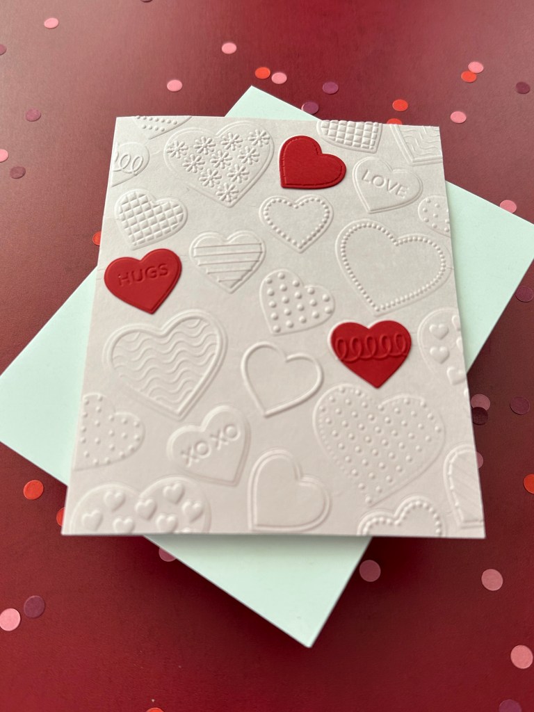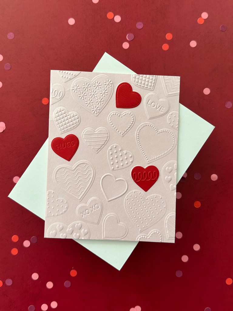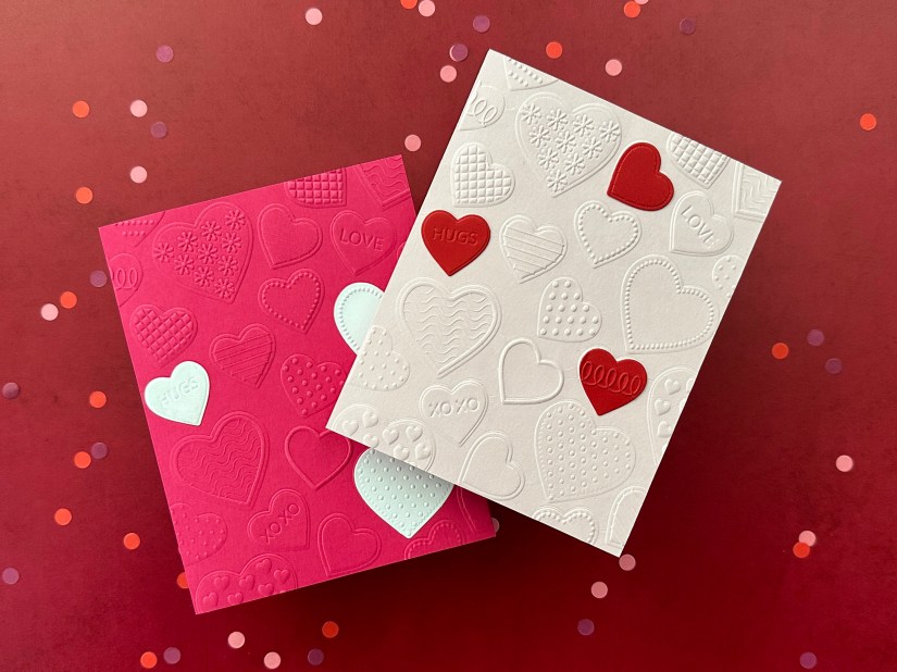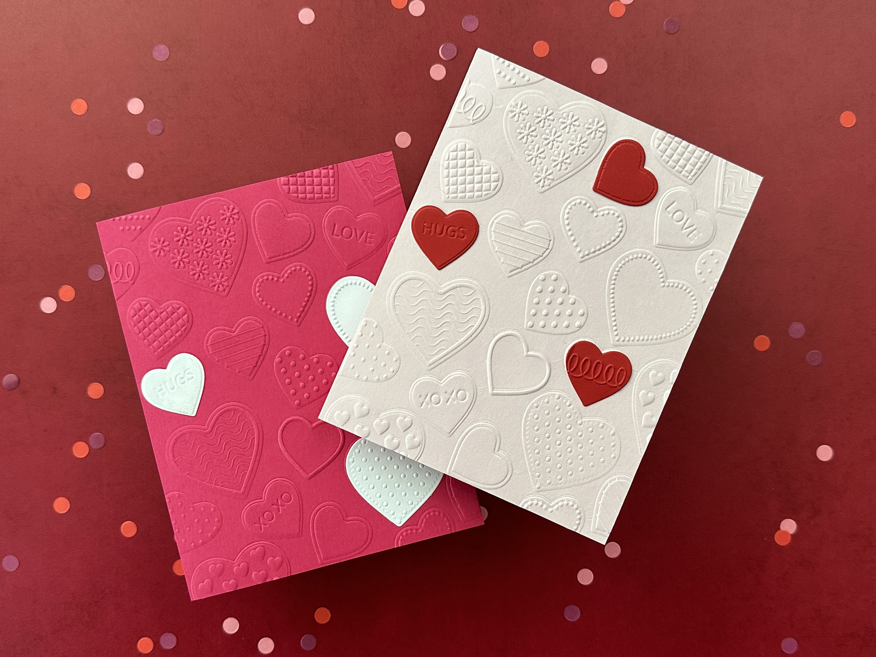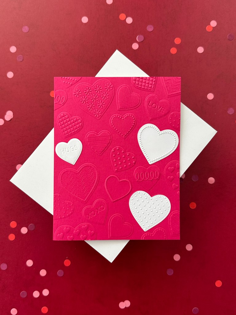 I used a dark pink and light pink cardstock for the card panels and ran each through my die cutting machine with the hearts embossing folder. Next I used the coordinating heart dies to cut a few white and red hearts, which I also put into the embossing folder.