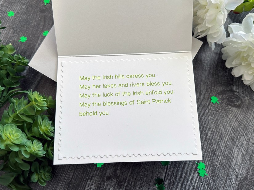 My first card uses some fun postage stamp rectangle dies and patterned paper. I die cut a piece of green paper with gold speckles slightly smaller than my white card base and adhered it to the front of the card. Next I die cut a smaller rectangle from both glitter paper and a lighter green paper with dark green speckles. I heat embossed the sentiment on the lighter green paper, adhered it at an angle over the glitter paper, and adhered it to the card base as shown. I found an Irish blessing online, and using my Cameo and sketch pen, I created 2 blessings for the inside of this card and the next. I used the same larger rectangle die to cut the blessing out and adhere it to the inside of my card. I think this is a really fun design that can be used for all kinds of cards!