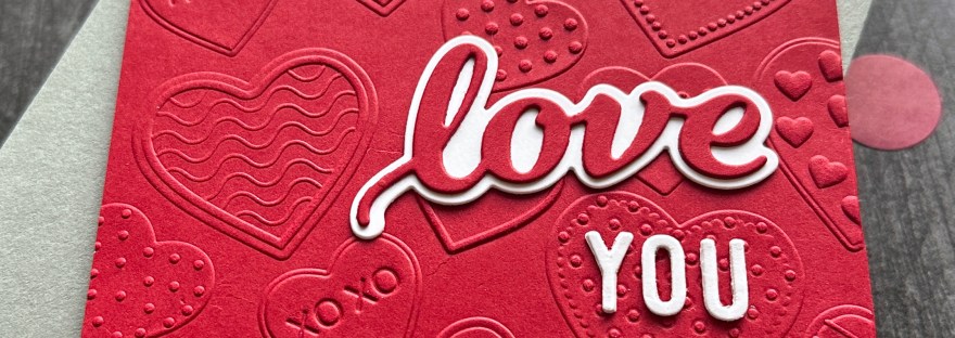 Hi Friends; I hope you've had a good week! Today I'm back with 1 more card using the heart embossing folder from my last post. This time, I used a dark red cardstock for the card panel, ran it through my die cutting machine with the hearts embossing folder and adhered it to a white… Continue reading Love You Card