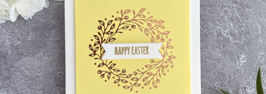 Hi friends, I hope you're having a good weekend. I made this card using the Spellbinders Glimmer Hot Foil System to add a wreath to a piece of yellow cardstock. I love how this system embosses foiled designs to create a letterpress look! I cut a piece of white cardstock into a sentiment strip, then… Continue reading Happy Easter